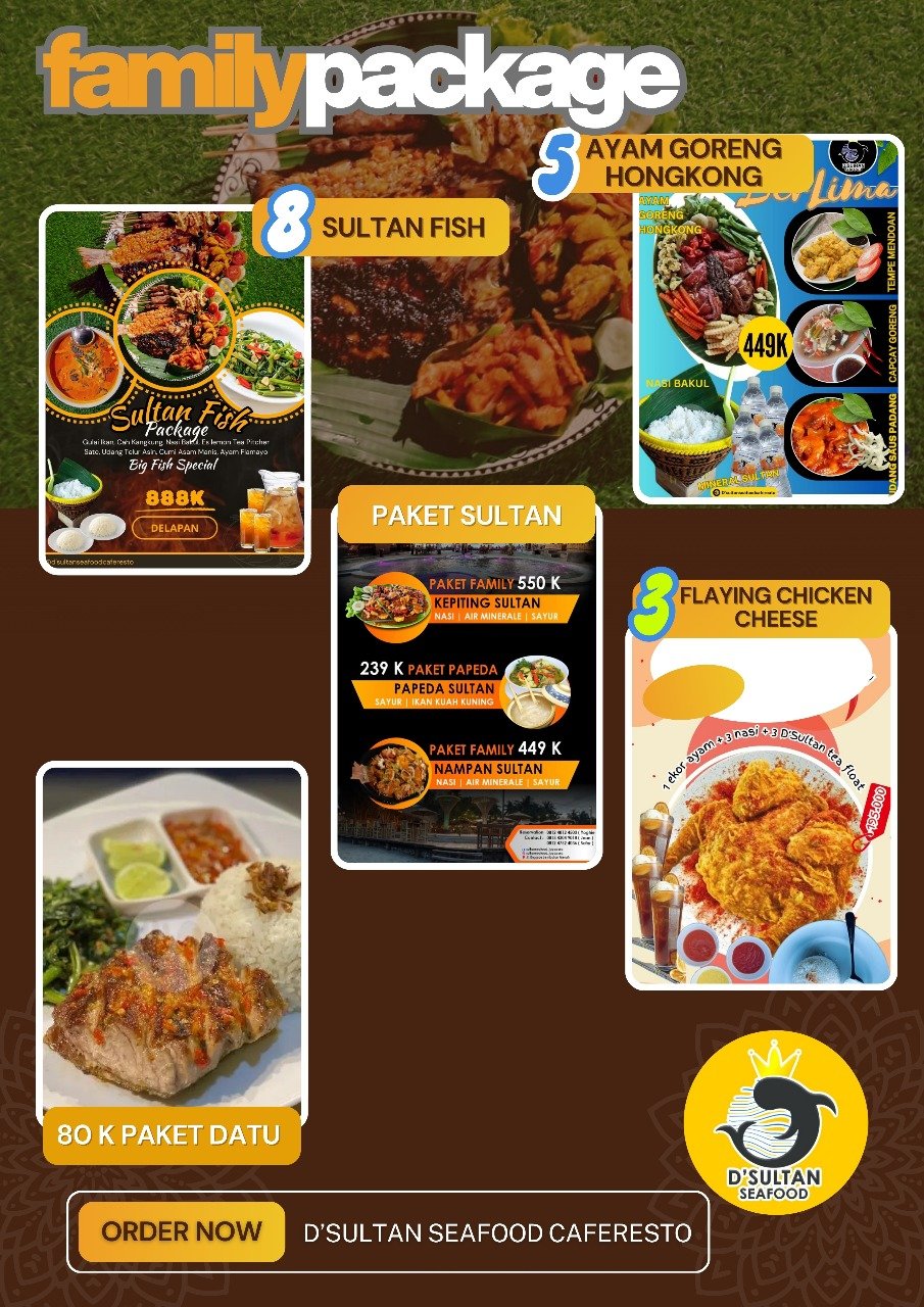 Di D’ Sultan Seafood Café & Resto, kami percaya bahwa momen terbaik adalah saat berkumpul bersama keluarga. Karena itu, kami menghadirkan Family Package, pilihan spesial untuk menikmati hidangan laut lezat dalam suasana hangat bersama orang-orang tercinta. Dengan porsi melimpah dan menu yang variatif, Family Package dirancang agar setiap anggota keluarga bisa merasakan kelezatan seafood khas Sultan. Mulai dari kepiting, udang, cumi, kerang, hingga ikan bakar, semuanya disajikan dengan bumbu istimewa yang kaya rasa. Tidak hanya memuaskan selera, paket ini juga hemat dan praktis untuk makan bersama, baik saat makan malam keluarga, arisan, maupun perayaan kecil yang penuh kebersamaan.